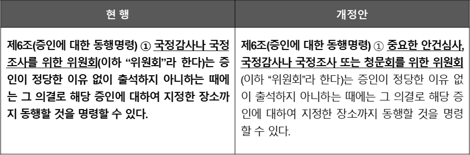 나. 중요 안건 심사, 청문회 시에도 증인 동행명령을 할 수 있도록 함(제6조 제1항)