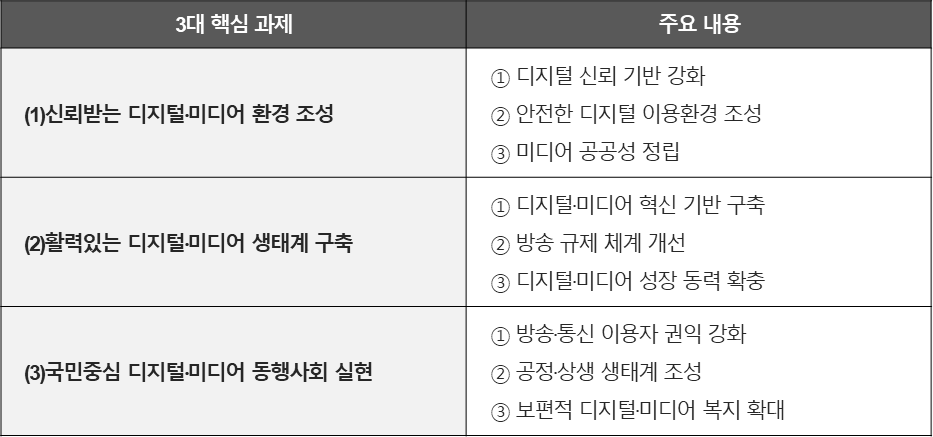 방통위는 디지털 플랫폼 및 AI 서비스의 일상화와 미디어 생태계의 경쟁 심화 등 변화된 환경을 고려하여, (1) 신뢰받는 디지털·미디어 환경 조성, (2) 활력 있는 디지털·미디어 생태계 구축, (3) 국민중심 디지털·미디어 동행사회 실현을 3대 핵심 과제로 추진할 계획입니다.