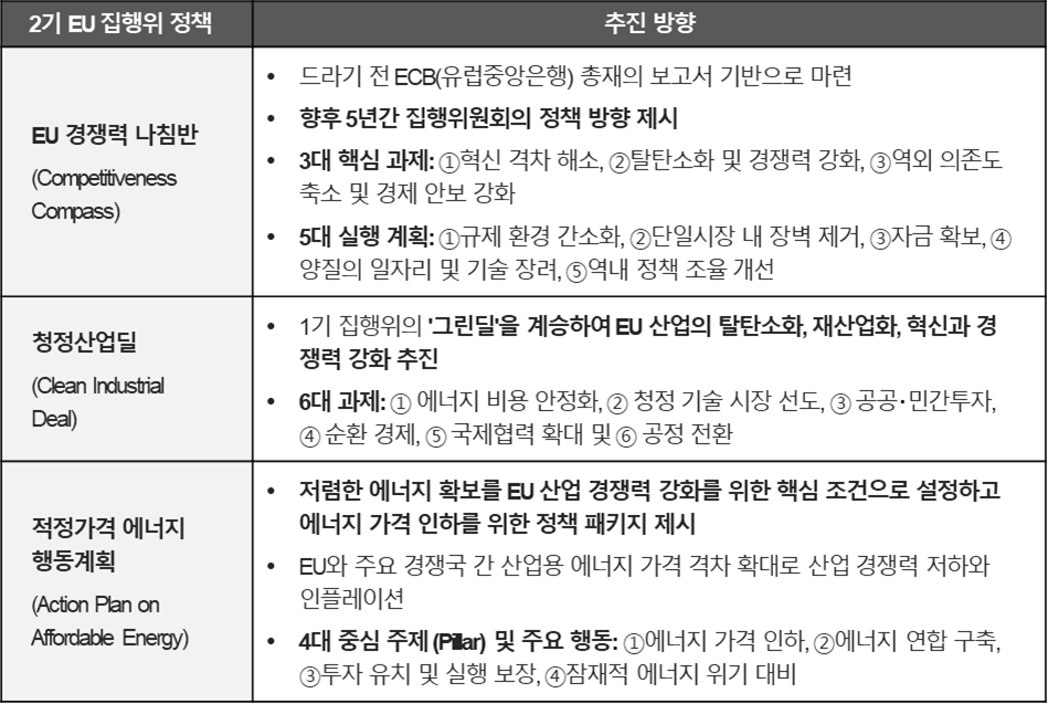 EU 집행위는 앞서 2025년 1월 「EU 경쟁력 나침반(Competitiveness Compass)」을 통해 향후 5년간의 경쟁력 강화 전략을 제시한 바 있습니다. 이 로드맵은 드라기 보고서의 권고를 토대로 △혁신 격차 해소, △탈탄소화와 경쟁력 균형, △공급망 등 대외 의존도 축소라는 3대 과제를 설정하고, 이를 위해 불필요한 규제 줄이기, 단일시장 장벽 제거, 자금 조달 지원, 양질의 일자리와 기술 확보, EU 역내 정책 조율 개선의 5대 실행계획을 내놓았습니다. 특히 불필요한 규제 환경 간소화가 최우선 과제로 강조되었는데, 이를 통해 대기업과 중소기업의 행정·보고 부담을 각각 25%, 35% 감축한다는 목표도 제시되었습니다. 이러한 정책 방향 아래 집행위는 그린딜을 계승·발전시킨 「청정산업딜(Clean Industrial Deal)」을 준비하고, 에너지 비용 완화 전략인 「적정가격 에너지 행동계획(Action Plan on Affordable Energy)」과 연계하여 친환경 전환과 산업 경쟁력의 조화를 모색하고 있습니다.