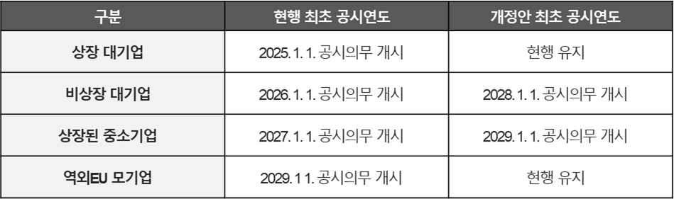 일부 기업에 대한 공시의무는 2년간 유예되는데, 기업별 적용 시기는 다음과 같습니다.