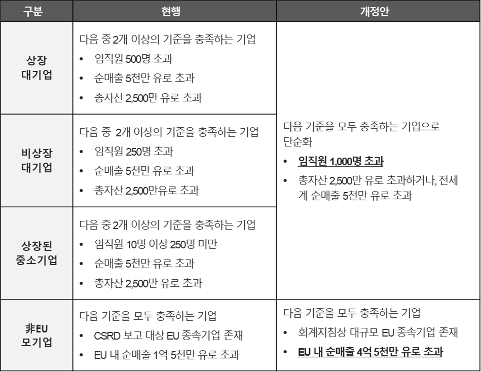 CSRD 적용 대상 기업 역시 다음과 같이 대폭 축소됩니다(현행 CSRD 적용 대상 기업 수의 80% 감소).