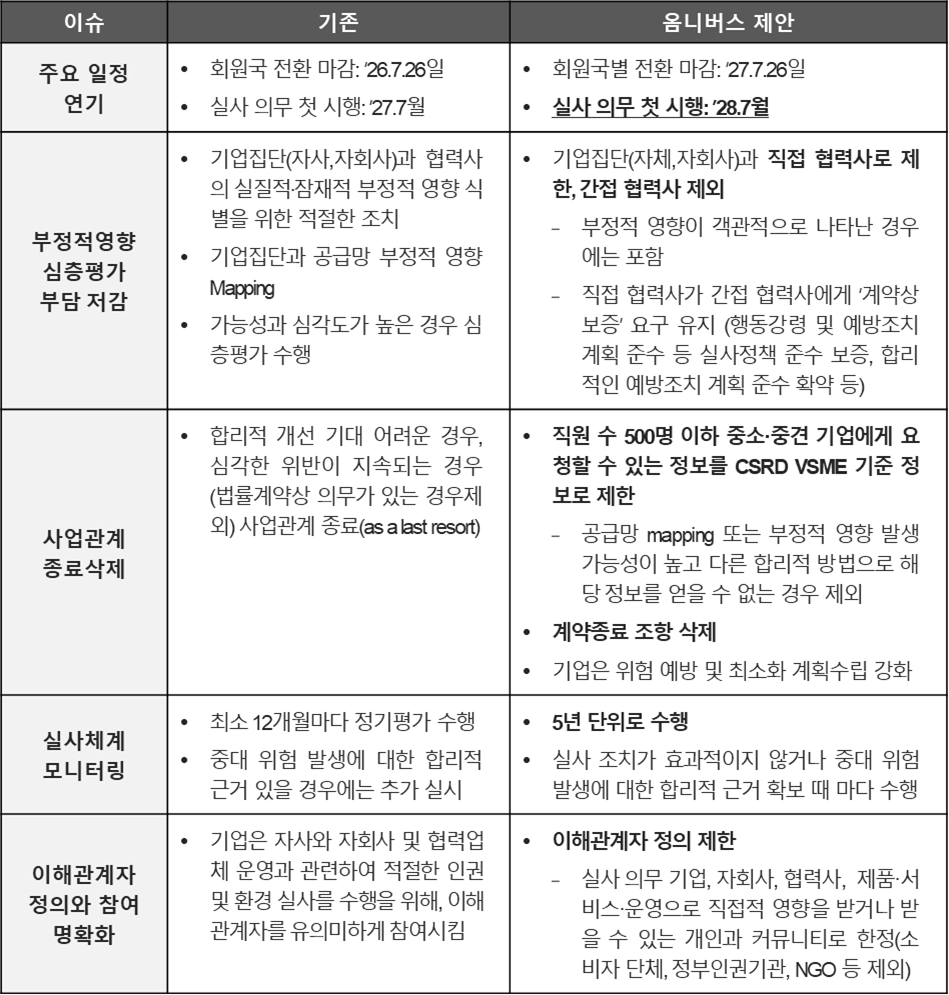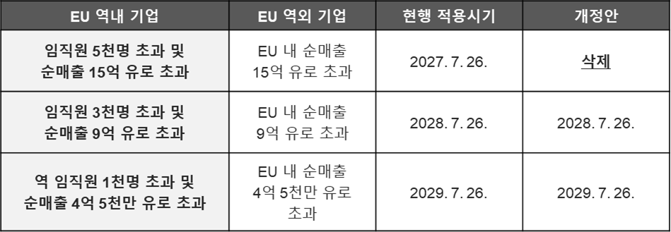 현행 CSDDD는 기업 규모(임직원 수 및 순매출 기준)에 따라 단계적으로 실사 의무를 부과하는 방식이었으나, 이번 개정안에서는 기존 1차 및 2차 적용 기업 기준을 통합하여, 임직원 3,000명 초과 및 순매출 9억 유로 이상 기업은 모두 2028년 7월부터 실사를 시행하도록 변경되었습니다.