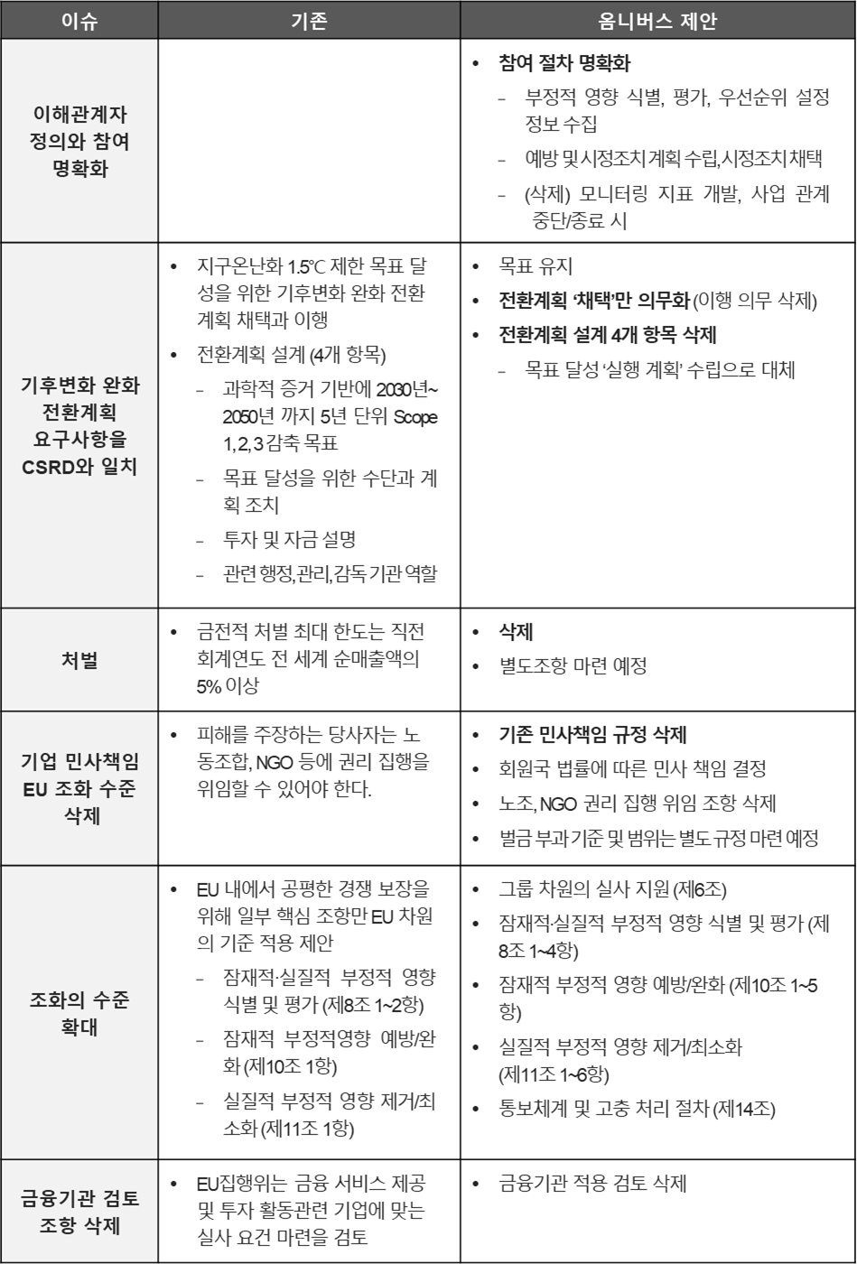 EU 옴니버스 패키지 법안은 기업의 지속가능성 규제 부담을 완화하고 경쟁력을 강화하기 위한 조치로, 규제의 명확성과 간소화를 통해 기업들이 보다 효율적으로 대응할 수 있도록 설계되었습니다. 그러나 이러한 규제 완화가 기업의 인권 및 환경보호에 대한 책임을 약화시킬 수 있다는 우려가 제기되고 있습니다. 특히, 시민사회단체는 이번 법안이 지속가능성 보고 및 관리 의무를 완화함으로써 산업계의 이익관계를 지나치게 반영했다고 비판하고 있습니다 .
