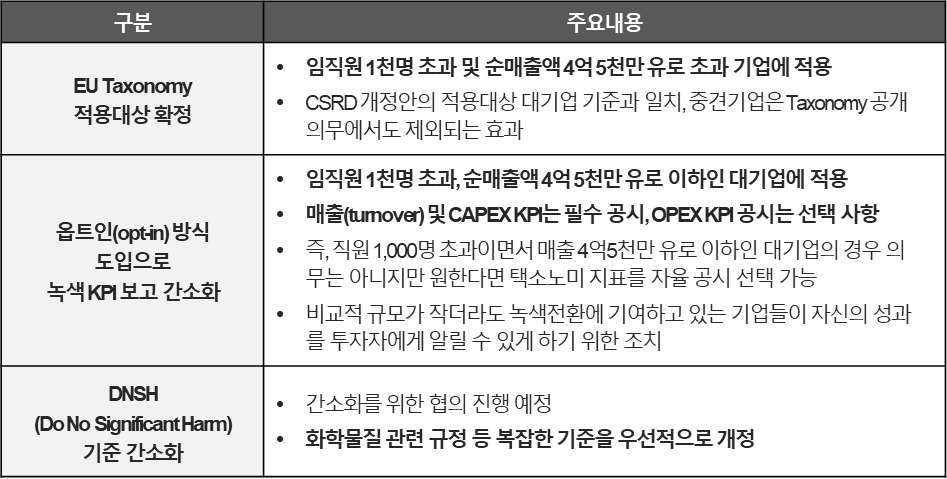 옴니버스 패키지 법안은 바로 EU 정책 기조를 구체화한 조치로서, 기존 CSRD(기업 지속가능성 보고지침), CSDDD(기업 지속가능성 실사지침), EU 택소노미(녹색분류체계), CBAM(탄소국경조정제도) 등 주요 지속가능성 규제를 한꺼번에 손질하려는 시도입니다. 개별적으로 운영되던 규제들을 정비하고 이행 절차를 단순화함으로써 기업들의 불필요한 부담을 줄이는 동시에, EU 역내 기업들의 지속가능한 전환 투자 여력을 높이고 경쟁력을 확보하려는 것이 핵심 목표입니다. 지속가능성이라는 큰 방향은 유지하되, 현실적인 이행 가능성을 고려해 규제 강도를 조정하는 데 중점을 두었다는 점이 특징입니다.