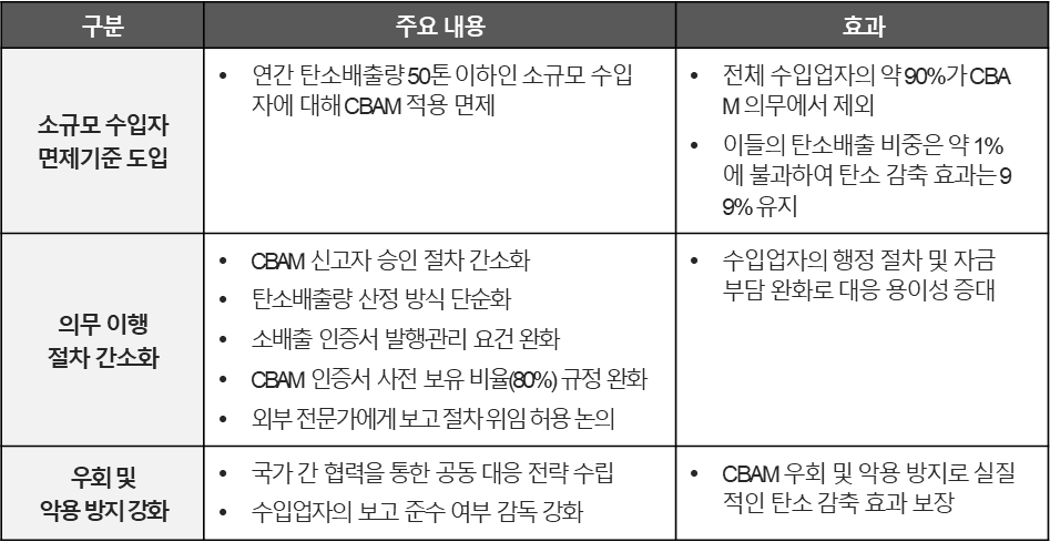 패키지는 CBAM(Carbon Border Adjustment Mechanism, 탄소국경조정제도)을 보다 효과적으로 운영하기 위한 개정안도 제안했습니다. CBAM 개정은 탄소배출량 저감 목적은 유지하면서도 중소기업의 부담을 덜어주고 전반적인 운영을 합리화하려는 것으로 볼 수 있습니다. 앞으로 완전 시행(2026년 이후)을 앞두고 기업들이 원활히 적응하도록 돕고, 제도 허점을 보완하려는 움직임으로 이해됩니다.