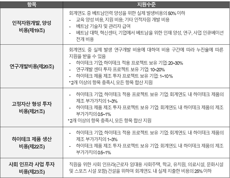 (iv) 연구개발 센터 투자프로젝트 보유 기업: 투자자본금 VND 3조 이상 및 투자승인 3년 이내 VND 1조 이상 지출; 수상 지정 하이테크 분야의 과학기술 기관 등록 필요.