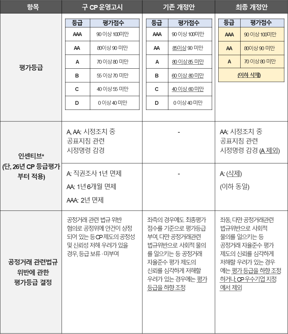 그러나 최종 개정안에는 위와 같은 국회나 경제 및 법조계의 문제의식을 적극적으로 수용하여, CP제도의 신뢰성을 유지하고, CP 도입운영 활성화에 크게 이바지할 수 있을 것으로 기대됩니다. 고시 개정안의 주요 내용은 (i) 6등급(AAA~D) 평가체계를 3등급(AAA, AA, A)의 CP 우수기업 지정제로 개편, (ii) A등급에 부여되던 직권조사 면제 등의 인센티브를 2026년 CP 등급평가부터 폐지, (iii) 공정거래 관련 법규 위반에 따른 등급하향을 감점제로 변경 및 심사보고서 상정 등에 따른 등급보류 폐지 등입니다.