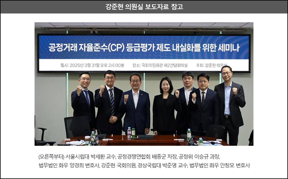 –(1) 국회 정무위원회 강준현 의원실은 지난 3. 31. “공정거래 자율준수(CP) 등급평가 제도 내실화를 위한 세미나*”를 주최하여, 공정위 및 경제계, 학계, 변호사 등이 한자리에 모여 CP 등급평가의 실효성 있는 운영방안 및 기존 개정안에 대한 보완사항 등을 논의하였습니다.