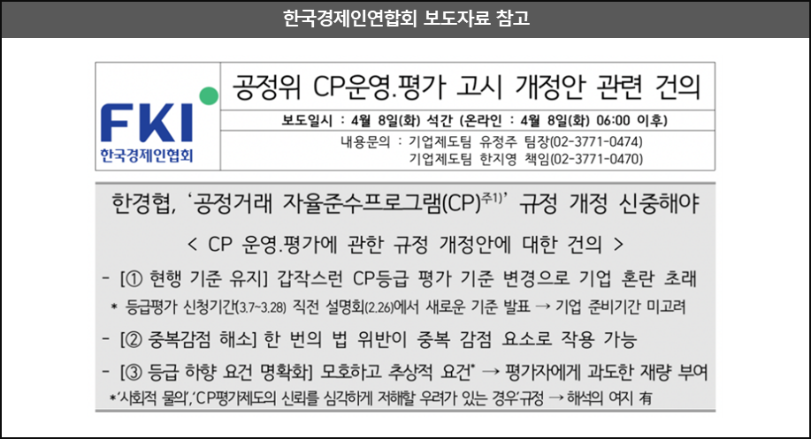 기존 개정안은 (i) 실질적 인센티브가 부여되는 AA등급의 평가점수를 상향(80점→85점)하고, (ii) 이를 2024년 CP운영실적을 평가하는데 소급적용하는 등 기업들의 혼란과 CP도입의지를 상당히 저해하는 측면이 있었습니다.