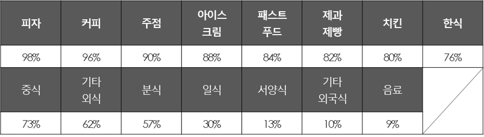 업종별로는 피자(98%), 커피(96%), 주점(90%), 아이스크림(88%),패스트푸드(84%) 등 브랜드·가맹점 수가 많은 주요 외식업종의 순으로 변경계약 체결률이 높았습니다.