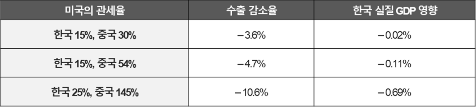국회예산정책처의 분석에 의하면, 최종 관세율 수준에 따라 한국 경제에 미치는 영향은 상당히 달라질 수 있으며, 특히 무역의존도가 높은 중국에 대한 미국의 관세율 수준이 주요 변수로 작용할 것으로 예측됩니다