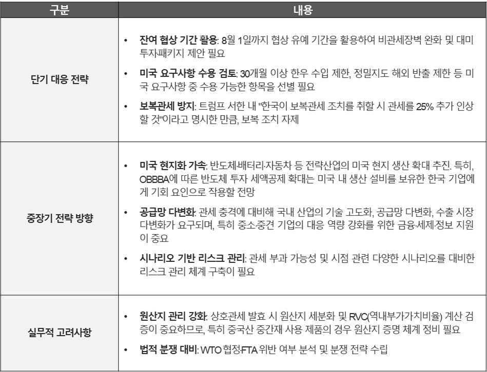 향후 관세 조치에 효과적으로 대응하기 위해서는 단기 협상 전략 뿐 아니라, 중장기적 산업 정책과 법적 대응 전략을 종합적으로 고려해야 합니다. 이러한 관점에서 한국 기업이 검토해야 할 주요 대응 방향을 세 가지 범주(단기 대응 전략, 중장기 전략 방향, 실무적 고려사항)로 구분하여 정리하였습니다.