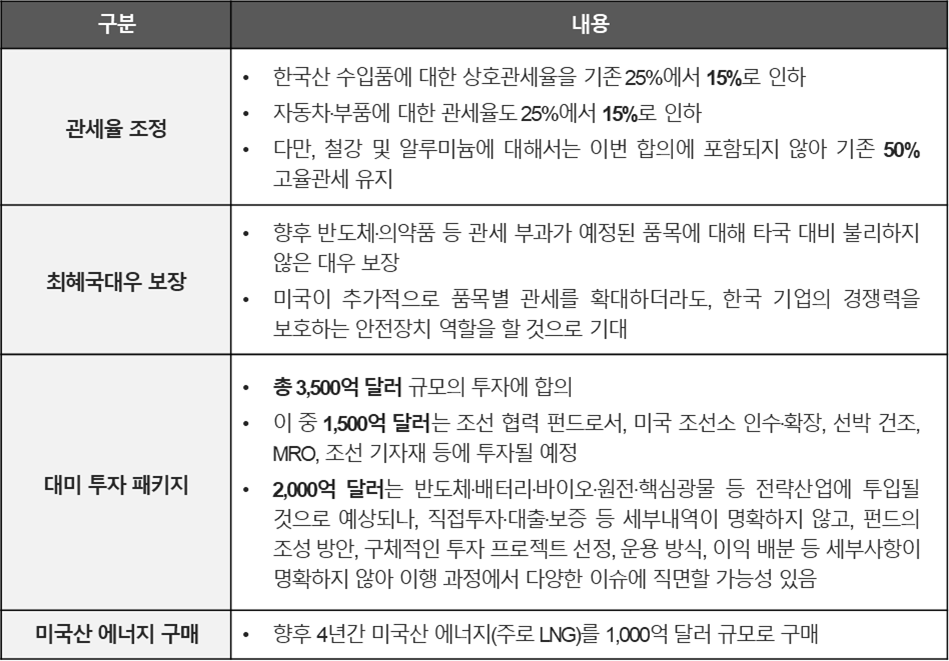 이번 협상 타결은 일본·EU와 동등한 조건을 확보함으로써 한국 수출기업의 경쟁력 저하 우려를 해소하고, 3,500억 달러 규모의 대미 투자 패키지 및 1,000억 달러 에너지 구매 합의를 통해 양국 간 경제협력의 새로운 틀을 마련했다는 점에 의의가 있습니다. 특히 반도체·의약품 등 향후 관세 부과 예정 품목에 대한 최혜국대우 확보는, 한국 기업의 글로벌 경쟁력 유지에 중요한 토대가 될 것으로 전망됩니다. 다만, 한미 FTA 하에서 누려왔던 무관세 체제에서 15% 관세가 부과됨에 따라, 한국의 대미 수출 전반에는 일정 수준의 타격이 불가피할 것으로 보입니다.