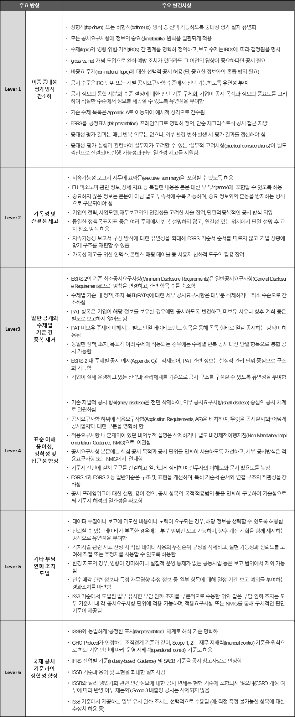 특히 복잡한 기준 체계로 인해 실행 장벽이 높았던 기존 ESRS의 한계를 보완하는 한편 지속가능 금융체계 구축 및 유럽 그린딜 정책 이행에 필요한 핵심 정보는 유지함으로써, 공시체계의 실무 적합성과 정책 정합성을 함께 확보하는 방향으로 설계되었습니다.