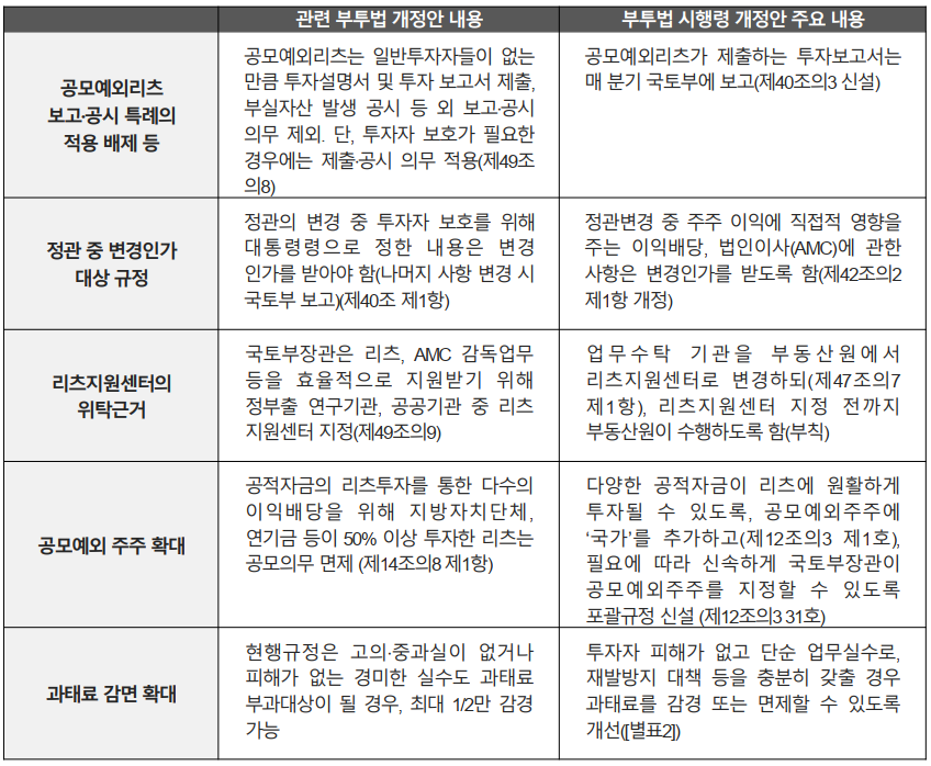 프로젝트리츠 및 지역상생리츠의 법적 근거를 포함한 부동산투자회사법(이하 “부투법”) 개정안은 지난 5월 1일 국회 본회의를 통과하여 오는 11월 28일 시행을 앞두고 있습니다.