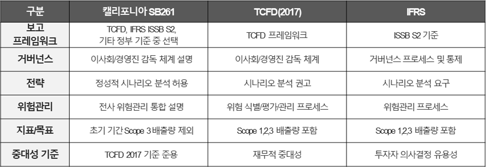 [캘리포니아 SB261과 주요 글로벌 기후공시 기준 비교]