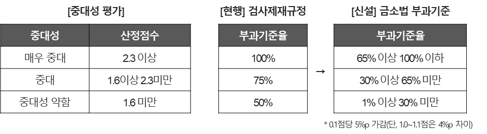 검사제재규정상 기본과징금 산출에 활용되는 ‘부과기준율’은 3단계(50-75-100%)만으로 구분하고 있어, 구체적인 사안의 위법성에 상응하는 과징금 부과가 어려운 측면이 있었으나, 금번 금소법상 과징금 부과기준은 중대성의 정도에 따라 1%부터 100%까지 부과기준율을 세분화하였습니다. 기존 3단계의 부과기준율은 5% 단위(1.0점~1.1점은 4% 차이)로 21단계로 세분화되었고, 기본과징금의 하한은 거래금액의 0.5%까지 가능하게 되었습니다.