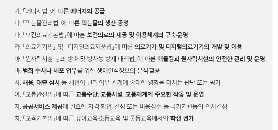 AI 시스템이 AI 기본법 제2조 제4호 각 목에서 정한 다음 10개 영역 중 하나에서 활용되는지 여부를 먼저 판단합니다.