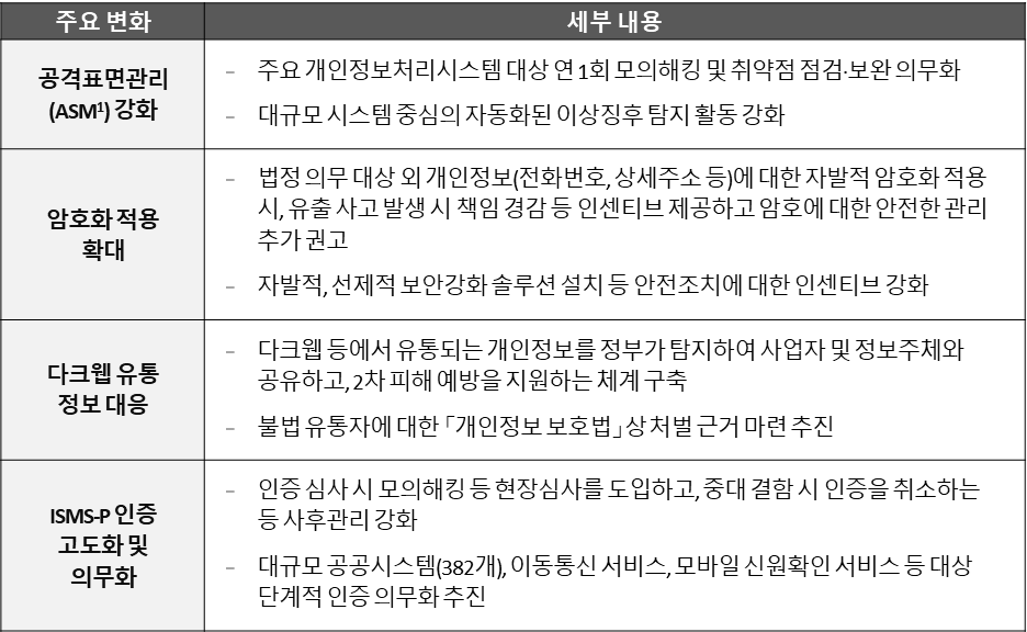 자발적으로 보안을 강화하는 기업, 공공기관에는 인센티브를 제공하는 반면 정기적 모의해킹 의무화 및 ISMS-P 인증 획득 후에도 중대결함 발견시 인증을 취소하는 사후대책이 강화되었습니다.