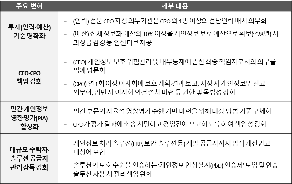 개인정보보호가 기업의 주요 리스크로 인식되기 위해 CEO를 개인정보 위험관리 최종 책임자로 명문화하고 전담 인력 추가 배치, 예산 확보 개인정보 처리 공급망 전반에 걸친 보호 조치가 마련되었습니다.