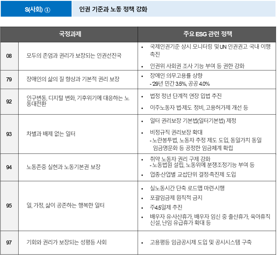 넷째, 인권과 노동 관행의 선진화는 기업 입장에서는 피할 수 없는 과제입니다. 국정과제 중 인권·노동 관련 과제가 7개로 가장 많다는 것은 정부의 정책 의지를 여실히 보여줍니다. 법정 정년 연장, 비정규직 권리 확대, 인권 기준 강화 등은 결국 기업의 인력 운영 방식을 근본적으로 바꾸어 놓을 것입니다. 근로 조건 개선, 정년 연장 대비, 차별적 HR 제도 개선 등을 통해 조직 내 신뢰와 사기를 높이고 인재 확보 경쟁력을 강화해야 합니다.