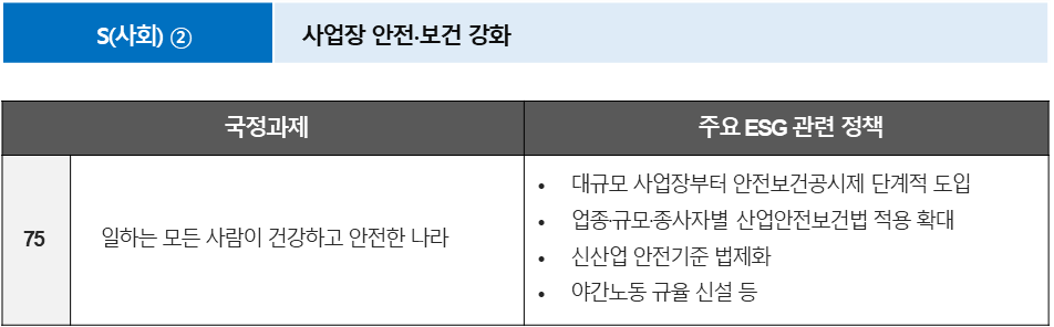 금번 국정과제에 정책과제로 안전보건공시제는 매년 사업장 안전보건관리체계, 안전보건투자규모, 안전보건 활동 실적 및 계획, 산재 현황 및 재발방지 대책 등을 공개하는 제도로서 산업안전보건법 개정안에 관련 내용이 반영되어 연내에 국회에 제출되어 내년중 입법화가 예상됩니다. 또한, 특수형태근로자, 플랫폼 노동자, 프리랜서, 신산업 노동자에 대한 안전보건기준도 마련되고 산업안전 보건법이 단계적으로 이들에게 적용되도록 법개정이 이루어 질 것으로 보입니다.