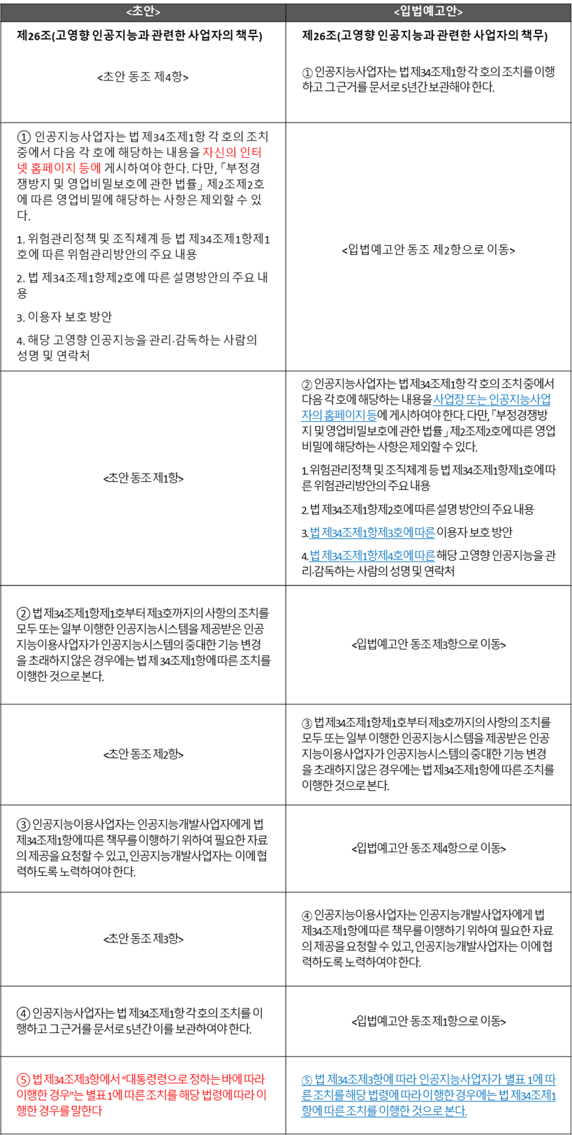 입법예고안은 앞서 공개된 초안과 비교하여 여러 조문에서 변경이 있었으며, 특히 고영향 AI 확인절차, 투명성 확보 의무, 사업자 책무 등 핵심 규제 사항이 구체화되었습니다. 본 뉴스레터에서는 초안과 입법예고안의 조문을 비교하여 분석하였습니다.