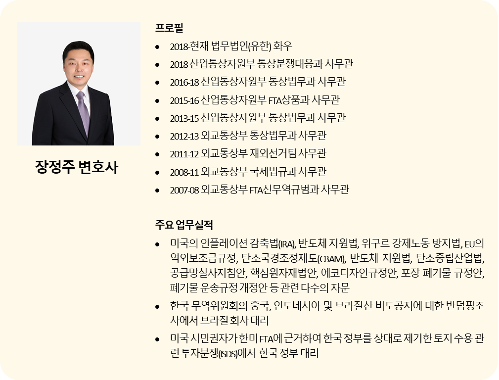 장정주 변호사는 한국 정부와 중소·중견 기업들이 미국 무역확장법 232조 조사 및 관세 부과 조치 등 수입규제 조치에 대응하는 과정에서 미국 정부의 수입규제조치를 분석하여 대응전략을 제시하는 등 다수의 자문을 제공하고, 국내 기업들의 미국 인플레이션감축법(Inflation Reduction Act, IRA), EU 공급망실사지침, 에코디자인규정, 포장폐기물규정 등과 같은 무역규제조치를 분석하여 대응방안 등에 대한 자문을 제공하며, 러시아에 대한 수출통제 및 금융제재에 관한 자문을 제공하는 등 외국의 규제조치에 대응하고 국내 기업의 수출에 기여한 공로를 인정받았습니다. 또한, 미국 정부의 상계관세 연례 재심에서 한국 정부를 성공적으로 대리하여 오고 있습니다.