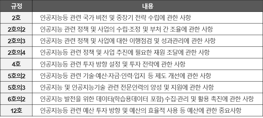 위원회의 심의·의결 사항을 대폭 확대하여, 명실상부한 국가 AI정책 컨트롤타워로서의 기능을 강화하였습니다. 구체적으로 다음 사항들이 추가되었습니다(제8조 제1항 각 호).