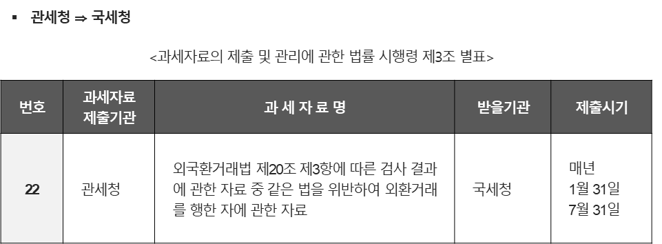 관세청 외환검사 결과 확인된 해외예금 미신고 자료는 「과세자료의 제출 및 관리에 관한 법률 시행령」에 의거 국세청에, 국세청이 확보한 해외금융계좌 미신고 자료는 「관세법 시행령」에 의거 관세청에 통보되어, 관세청은 국세청 해외금융계좌 미신고 자료를 근거로 외환검사(조사)를 실시하고, 국세청은 관세청 해외예금 미신고 자료를 향후 과세자료로 활용합니다.