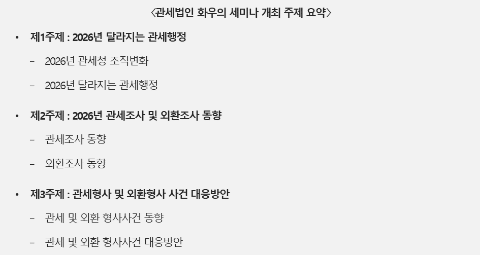 이에 따라, 관세법인 화우는 법무법인 화우와 공동으로, 최근 관세청의 외환검사 강화 추진 내용을 전파하고, 기업 리스크 대응전략을 공유하는 세미나를 2026년 1월 23일 개최하였습니다. 이번 세미나는 화우 조세그룹 변호사와 관세법인 화우 관세사들이 2026년부터 달라지는 관세행정과 외환검사 동향을 납세자 또는 수출입기업 관점에서 체계적으로 정리하고, 기업 현장에서 예상되는 리스크와 대응방향을 공유하기 위해 마련되었습니다.