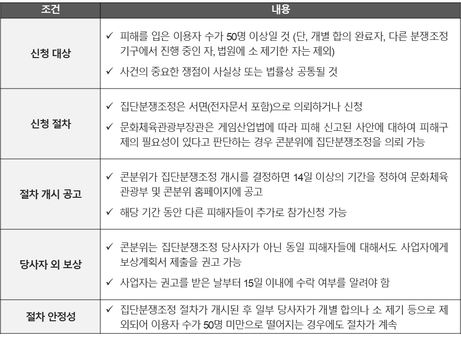 특히 문화체육관광부장관이 직권으로 집단분쟁조정을 의뢰할 수 있어, 게임사가 자발적으로 분쟁조정에 응하지 않더라도 조정절차가 개시될 수 있습니다.