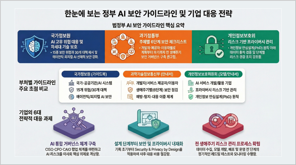 2024년 12월 'AI 발전과 신뢰 기반 조성 등에 관한 기본법'이 국회를 통과하며 제도적 기반이 마련되었고, 이어 개인정보보호위원회가 2024년 12월 AI 프라이버시 리스크 관리 모델을, 2025년 8월 생성형 AI의 생애주기 각 단계에서 개인정보 보호법 준수를 위한 안내서를 공개, 2025년 12월 국가정보원과 과학기술정보통신부가 AI 시스템의 보안 가이드라인을 각각 공개함으로써 기업들이 AI 보안과 개인정보 보호를 통합적으로 관리할 수 있는 범정부 차원의 포괄적 프레임워크가 완성되었습니다.