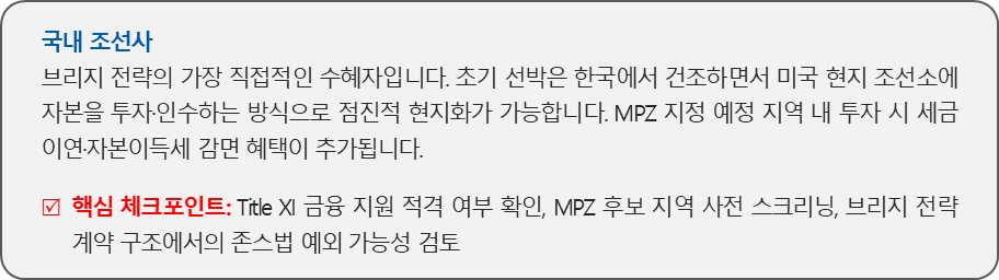 • 해양 번영 구역(Maritime Prosperity Zones, MPZ) 지정 : 트럼프 1기 때 성공을 거둔 기회특구 (Opportunity Zones) 모델을 조선업에 적용하여, 지정 지역 내 투자에 세제 혜택과 규제 완화 제공