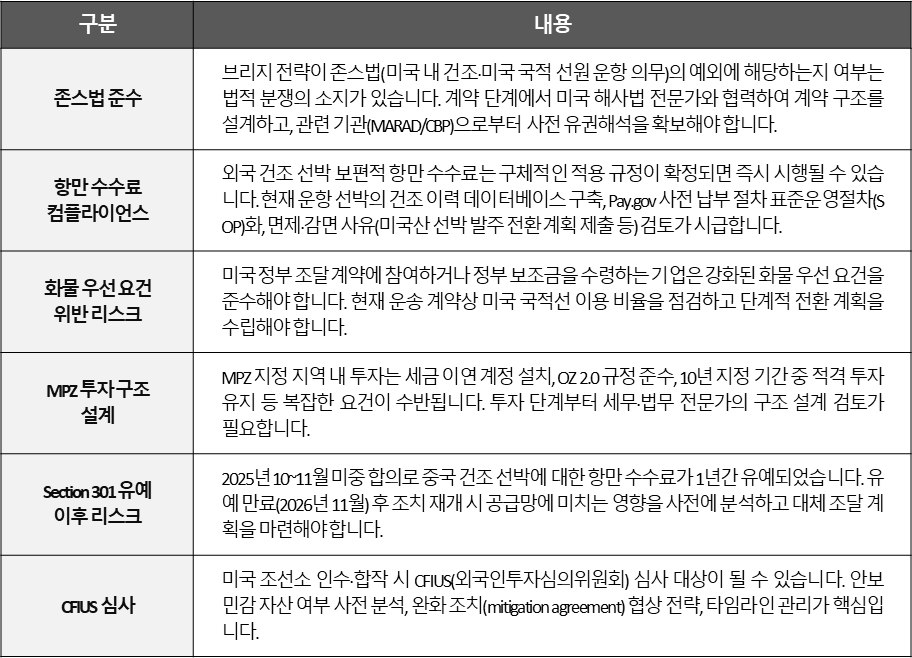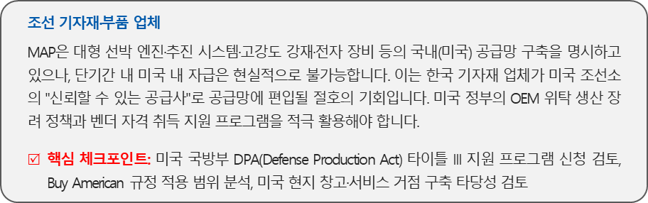 다만, 위 전략은 존스법(Jones Act)의 ‘미국 내 건조’ 명시 부분을 우회할 수 있는 구체적 경로를 제시하고 있지는 않습니다.