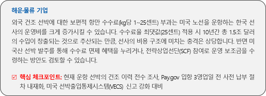 • 화물 우선 요건 강화: 美 정부 화물의 국적선 운송 비율을 현행 50%에서 점진적 상향