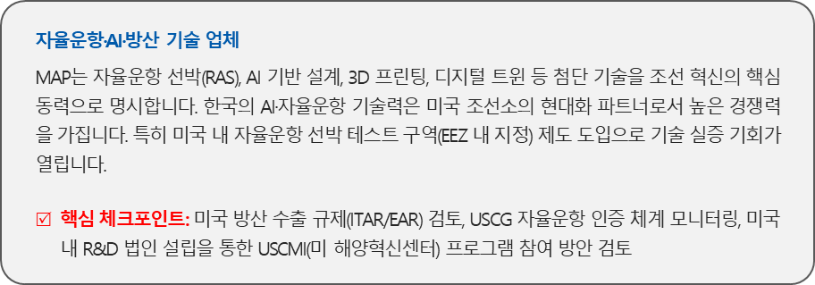 MAP보고서에 따르면, 현재 미국은 전 세계 상업용 선박의 1% 미만만을 건조하고 있으며, 이러한 구조적 취약성은 단순한 산업 경쟁력 문제를 넘어 국가 안보의 심각한 위협으로 인식되고 있습니다.