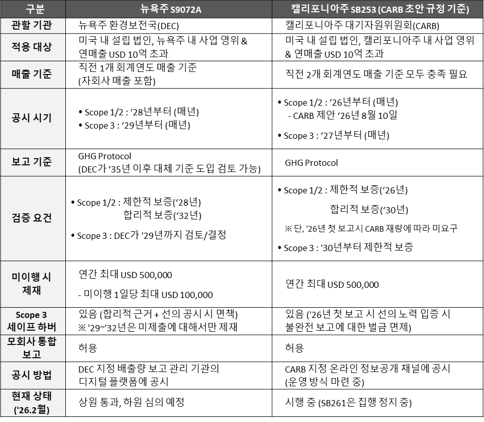 금번 뉴욕주 법안은 캘리포니아주의 법안(SB253)과 상당한 유사성을 가지면서도, 적용 기준, 공시 시기, 검증 요건 등에서 차이점이 존재합니다. 양 규제의 주요 내용을 항목별로 비교하면 다음과 같습니다.