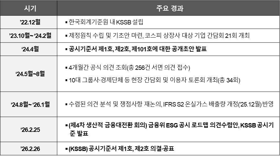 이러한 배경 하에 한국회계기준원은 2022년 12월 KSSB(한국지속가능성기준위원회)를 설립하고, 약 3년에 걸쳐 국내 지속가능성 공시기준을 제정하였습니다. 2024년 4월 공개초안을 발표한 후 약 4개월간의 공식 의견 조회, 10대 그룹사·경제단체 등과의 현장 간담회 및 이용자 토론회 등을 통한 이해관계자 의견 수렴 을 진행하였습니다. 이후 수렴된 의견에 대한 분석 및 쟁점사항 재논의, IFRS S2 온실가스 배출량 개정(’25.12월) 사항 반영 등을 거쳐, 2026년 2월 25일 ‘제4차 생산적 금융대전환 회의’에서 공시기준이 발표되었고 2월 26일 KSSB의 의결을 통해 공표되었습니다.