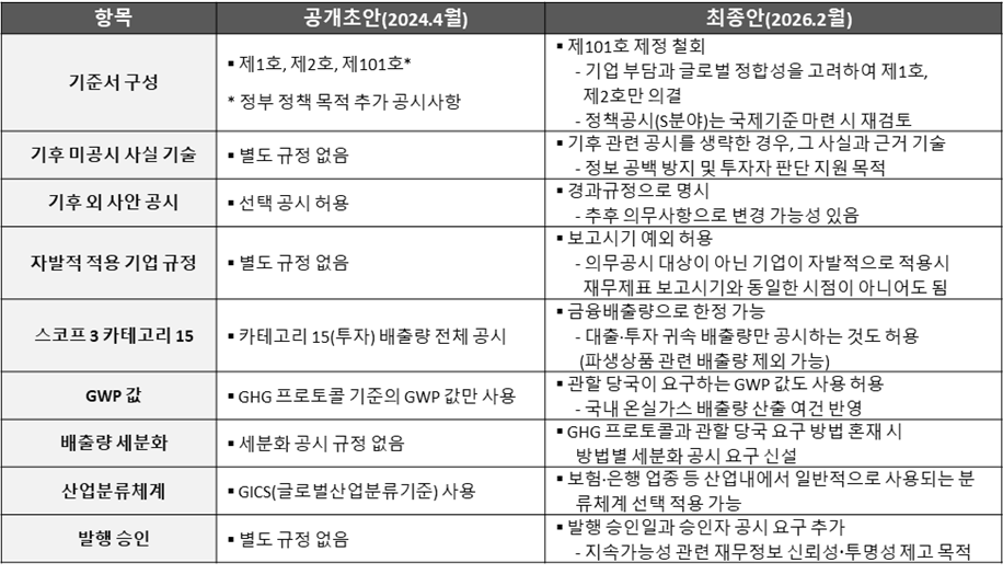 2024년 4월 발표된 공개초안에 대해 약 4개월간 총 256건의 의견이 접수되었으며, 이를 반영하여 최종안에서는 일부 변경이 이루어졌습니다. 가장 주목할 변경은 제101호(정부 정책 목적 추가 공시사항) 제정이 철회된 것이며, 제1호의 본문 구조가 60개에서 87개 문단으로 재편되고 자발적 적용 기업을 위한 부록 F가 신설되었습니다. 기후 공시 측면에서는 스코프 3 카테고리 15(투자)를 금융배출량으로 한정할 수 있도록 하고, 국내 온실가스 측정 여건을 반영하여 관할 당국이 요구하는 GWP 값 사용을 허용하는 등 실무적 유연성이 강화되었습니다. 주요 변경사항을 정리하면 다음과 같습니다.