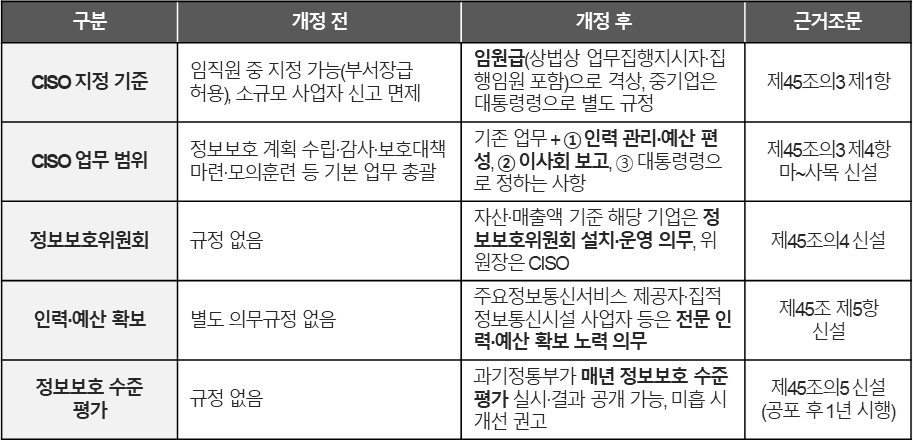 • 정보통신망법 제45조의3에 따라 현 CISO가 임원급(상법상 업무집행지시자·집행임원 포함)에 해당하는지 확인하고, 미충족 시 인사위원회에 직급 조정 안건을 시행일 전까지 상정할 것